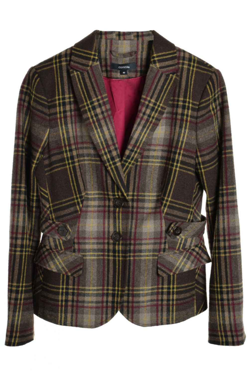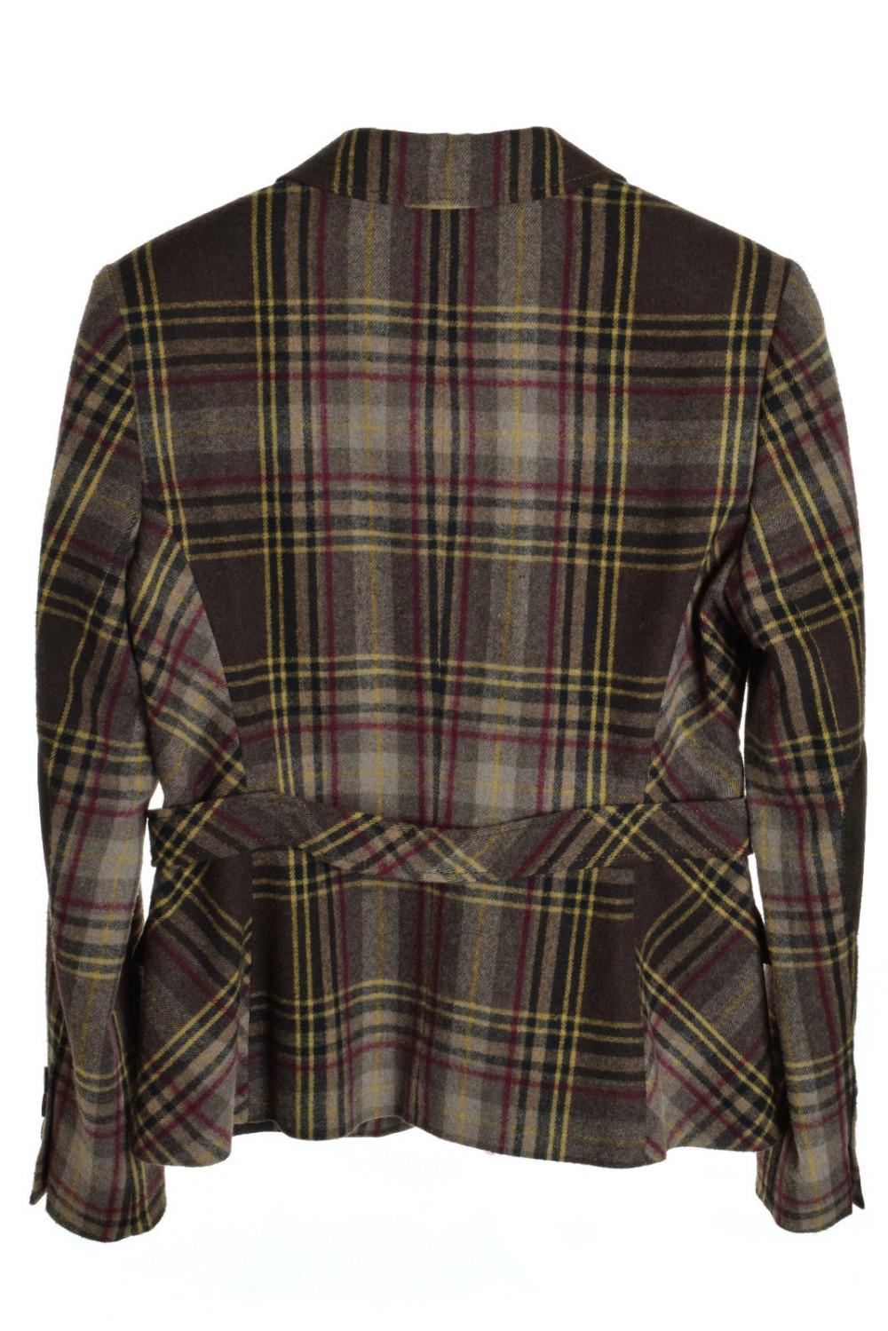 Sötétbarna kockás, könyökfoltos, retro női blézer.